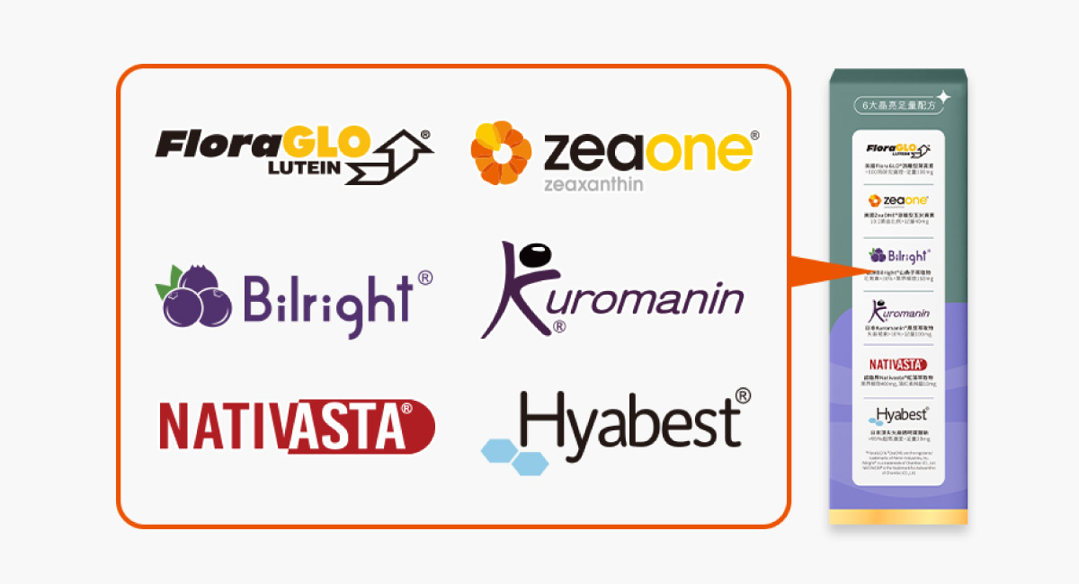 除此之外,山桑子花青素濃度高達36%,添加了160mg。 美國FloraGLO®游離型葉黃素100mg,濃度10%,葉黃素純量為10mg;美國ZeaONE®游離型玉米黃素40mg,濃度5%,玉米黃素為2mg,就達美國AREDS2黃金比例10:2,以上都是科學研究有感量。