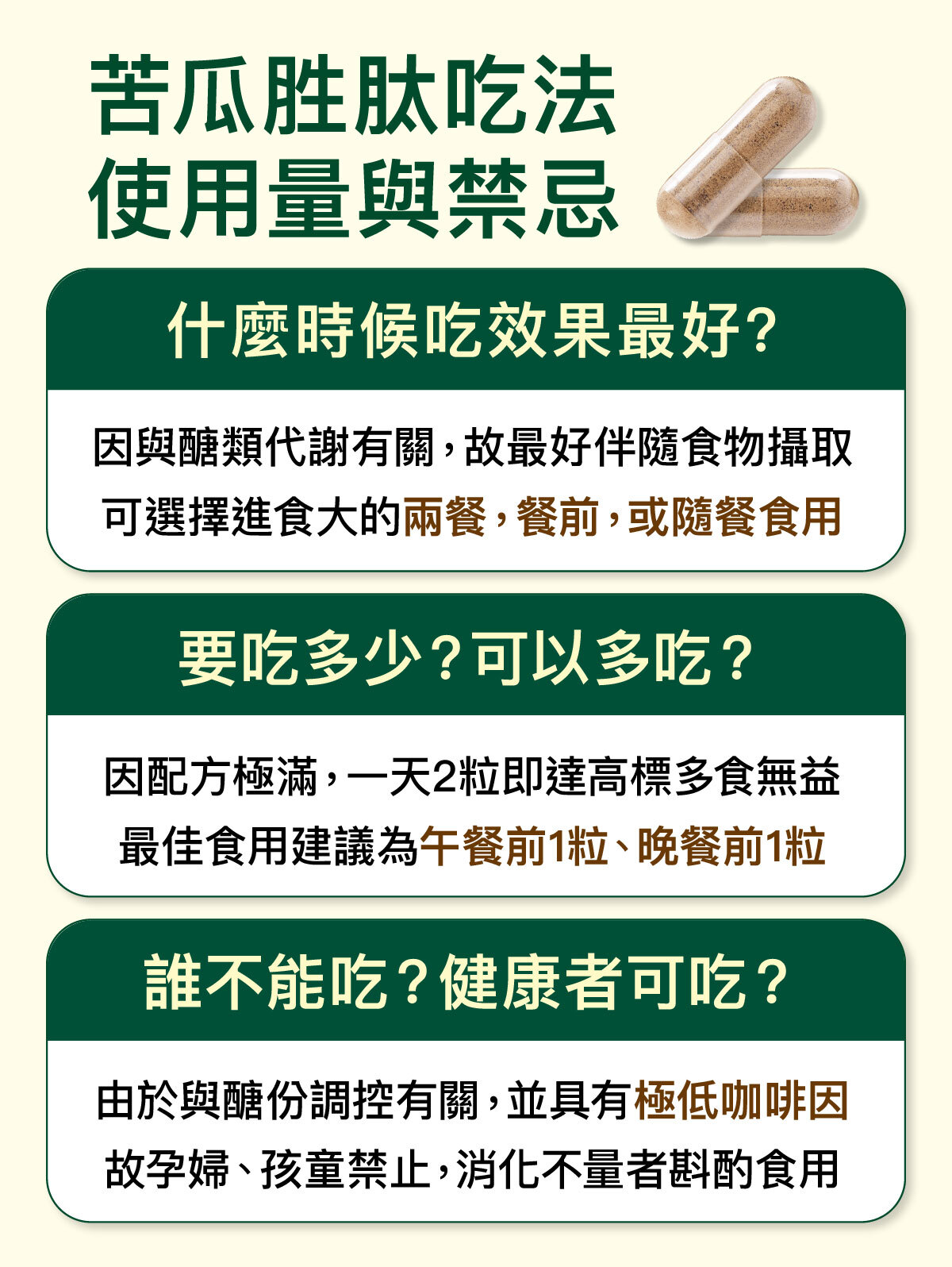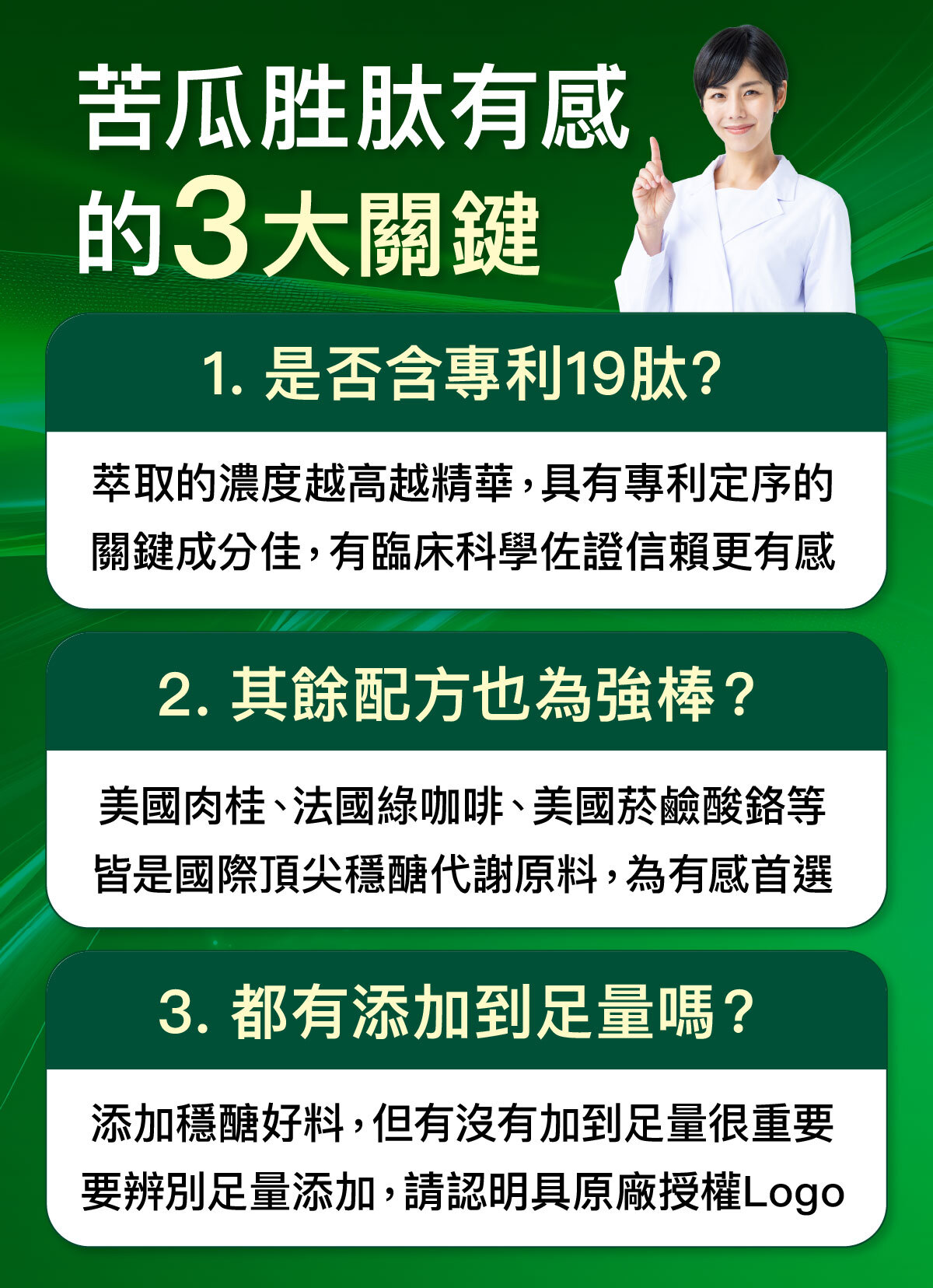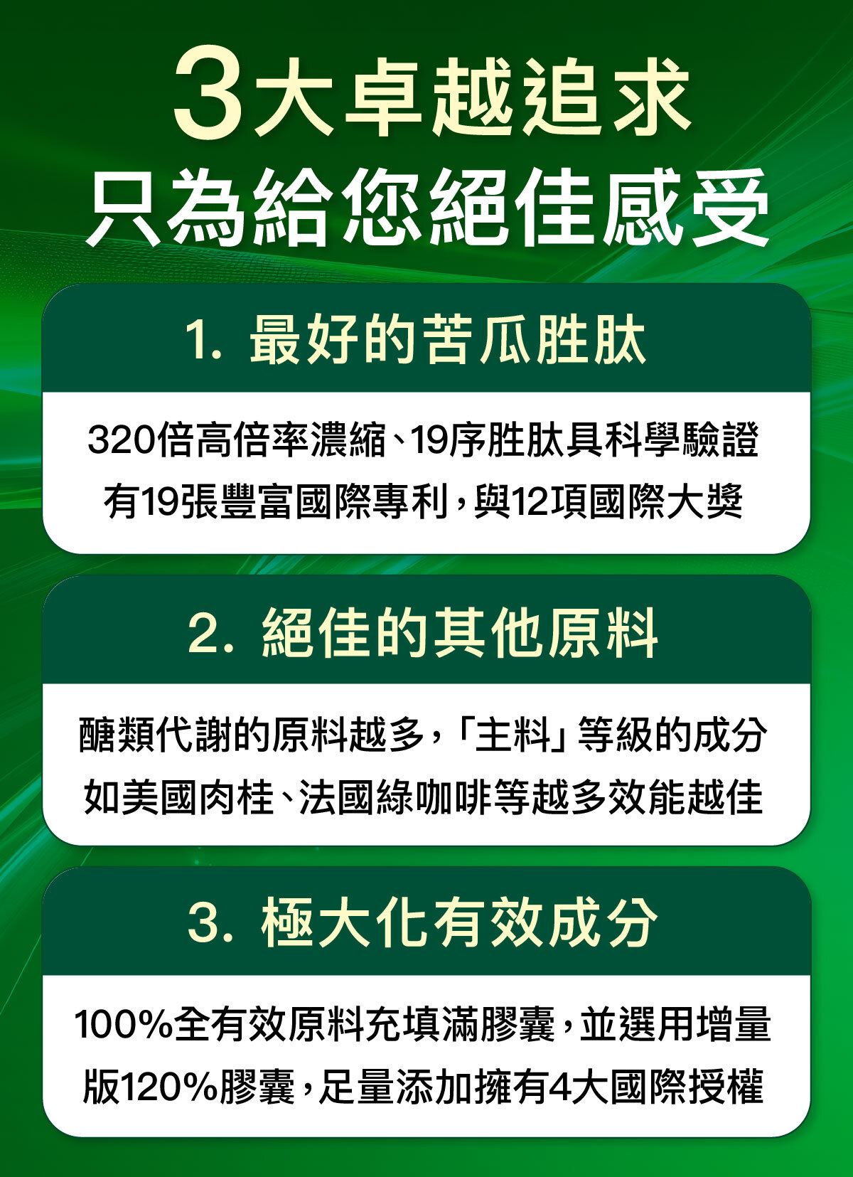 比起明星代言人、華麗的行銷,我們更認為把配方選好,然後加滿給您,對您才是最好的。所以這款苦瓜胜肽,就是以3大最好為目標設計。
