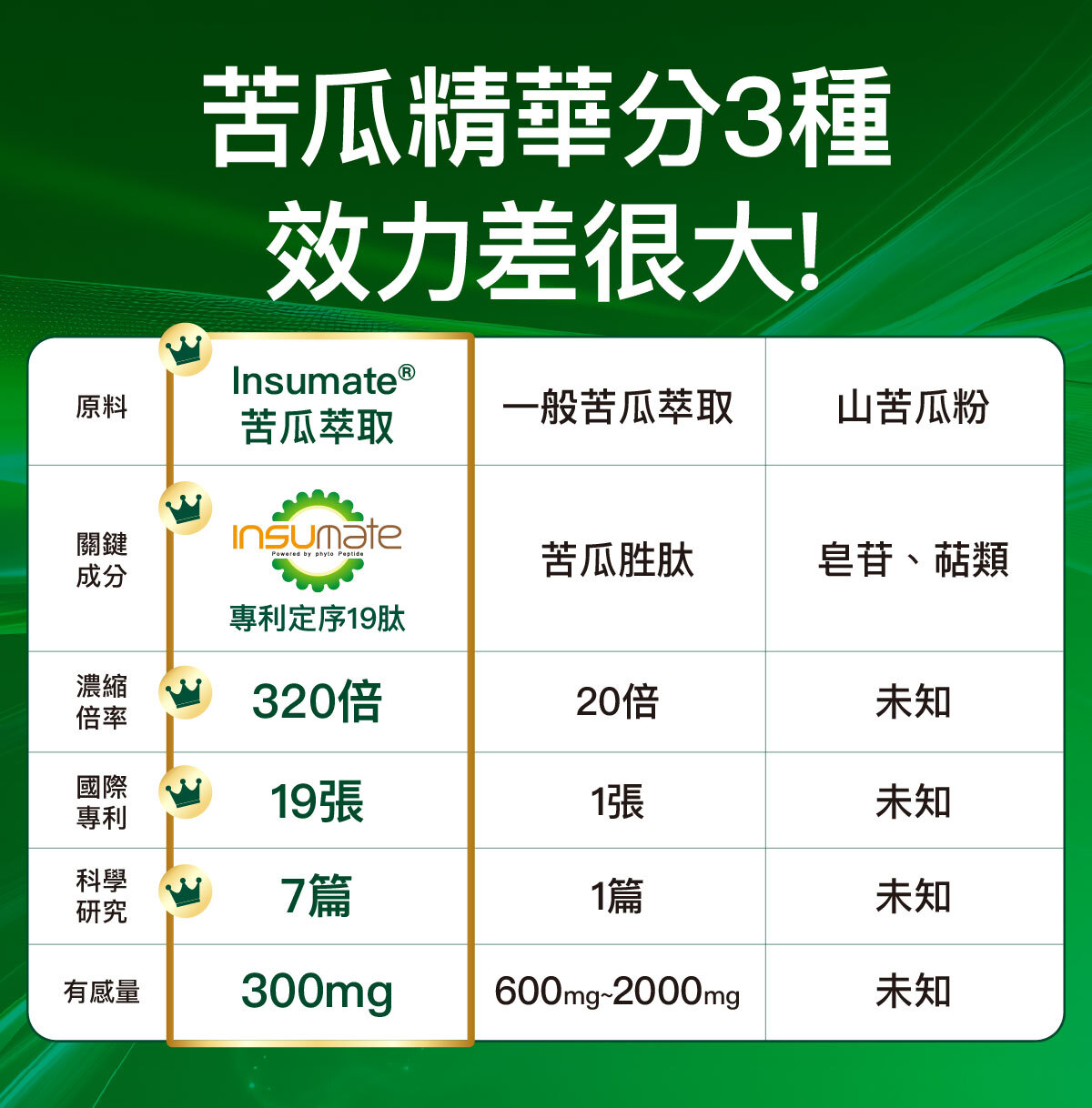 濃度的高低,決定有感攝取量的高低,斯巴達300壯士足以抵抗波斯大軍。而320倍超臨界萃取的苦瓜萃取物,其實僅食用300mg即達科學有感。相對低倍數萃取的原料,多需食用600mg以上,甚至1000mg以上,但科學佐證可能還不及擁有7篇科學研究的Insumate®苦瓜萃取。