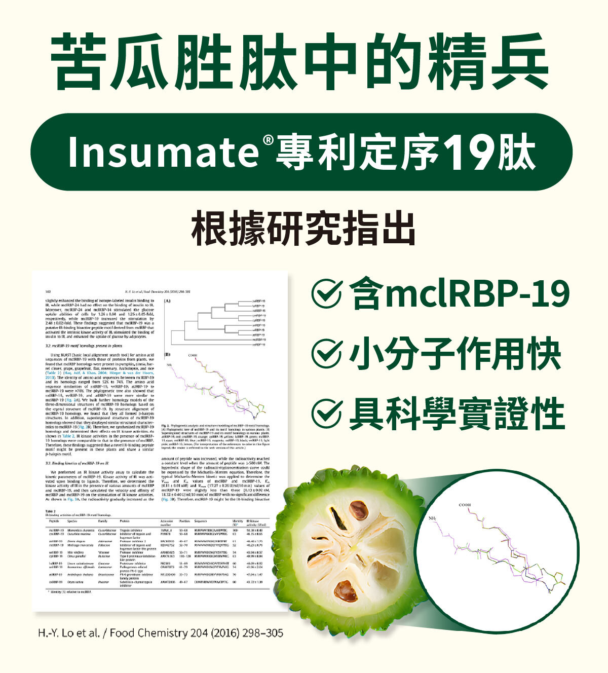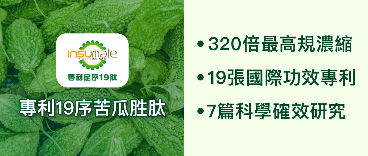 除了可維持糖類正常代謝的鉻一定要吃外,苦瓜萃取物中的專利定序19肽,為台灣醫學博士群耗時12年以上,從苦瓜5000多個胺基酸片段中篩選出第50-68號的氨基酸序列,具備高度活性。