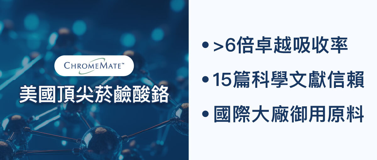 鉻中高手就是美國的ChromeMate®菸鹼酸鉻,由國際生技製藥巨擘瑞士Lonza的美國廠製造,獨特的Oxygen-coordinated結構,可使其吸收率提升6倍以上。具備高濃度、高吸收率、高穩定性的優點,為國際眾多代謝產品的首選原料。