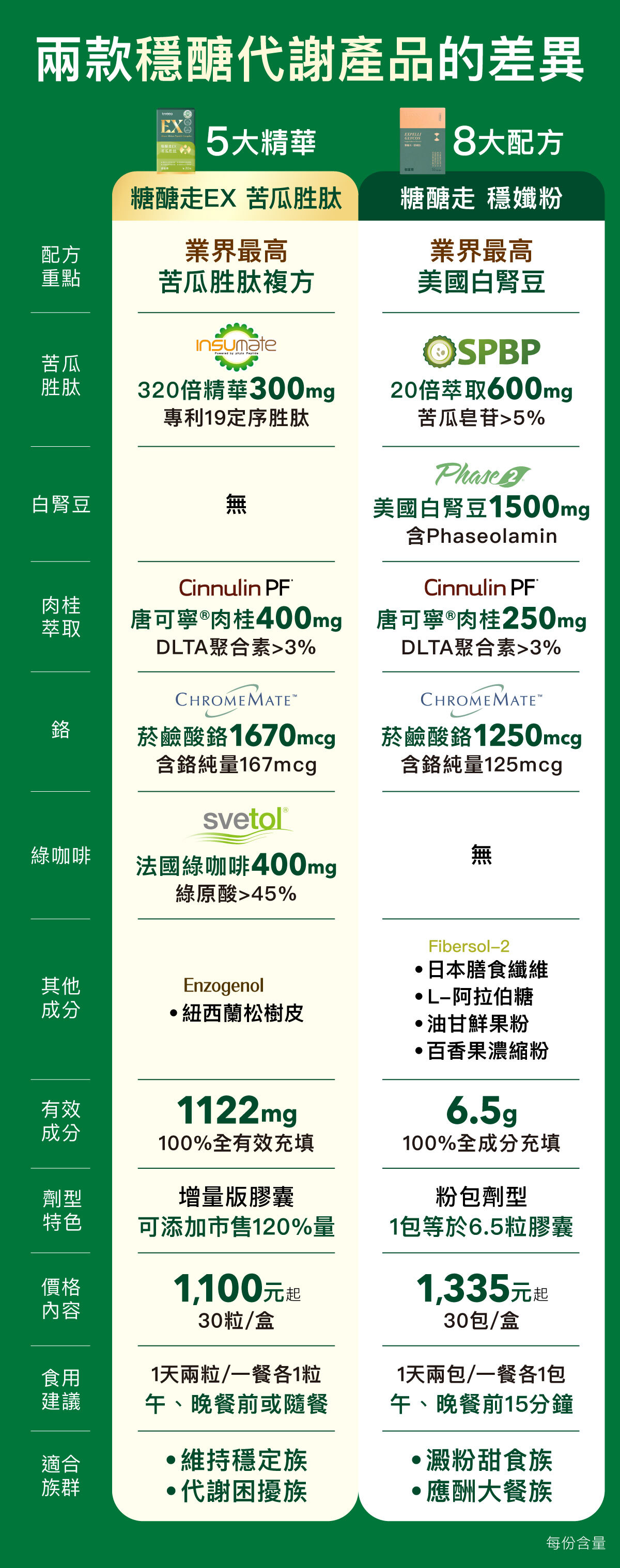 糖醣走穩孅粉為粉包設計,1包等於6.5粒膠囊,為市售同級中最高量添加首選。糖醣走EX苦瓜胜肽為膠囊設計,增量版120%規格,為同級產品中最高量添加。