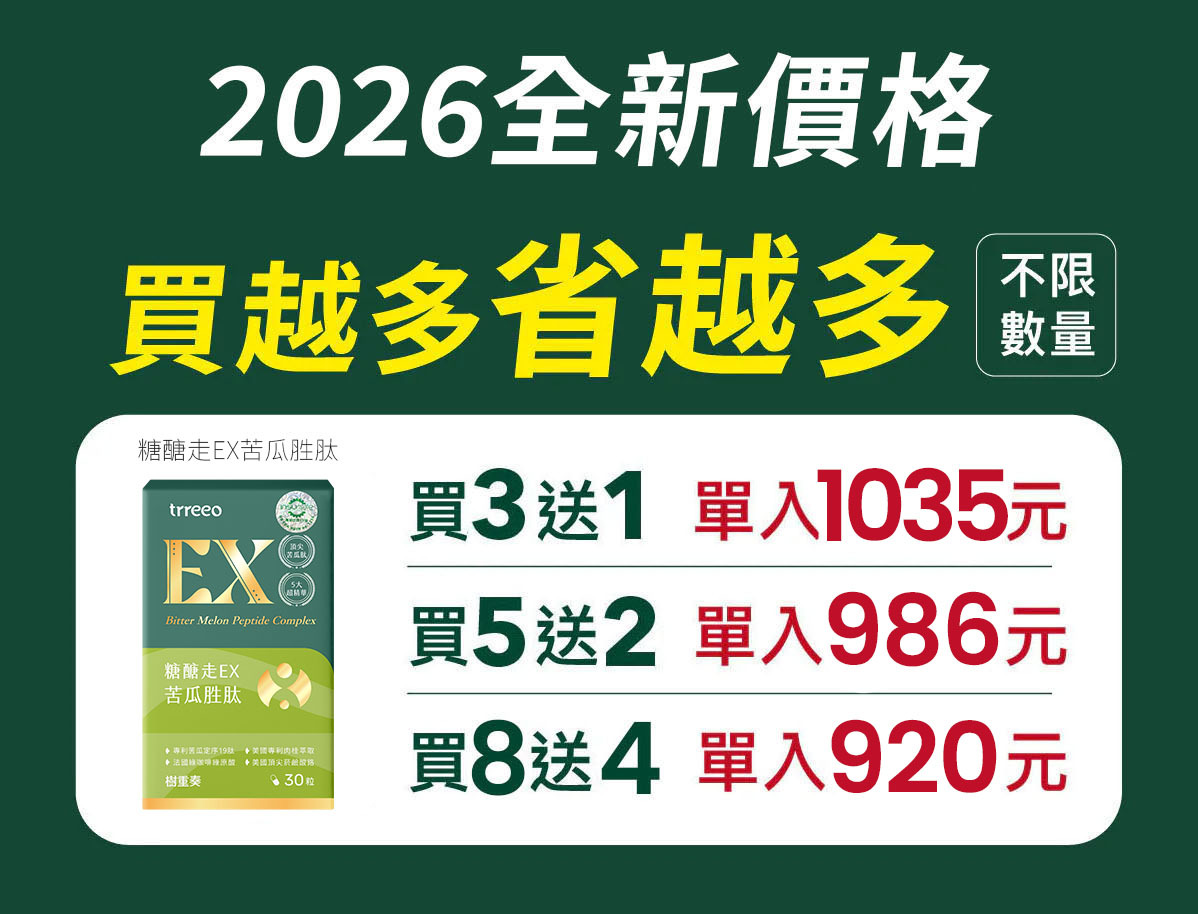 樹重奏針對您想追求醣類穩定代謝、巔峰足量的穩醣需求,提供專利Insumate®定序19肽苦瓜胜肽複方,並用920元起,買3送1、買5送2、買8送4的全新價格回饋給您!挺您健康維持、促進代謝、營養補給!想暸解更多優惠內容,請往下看!