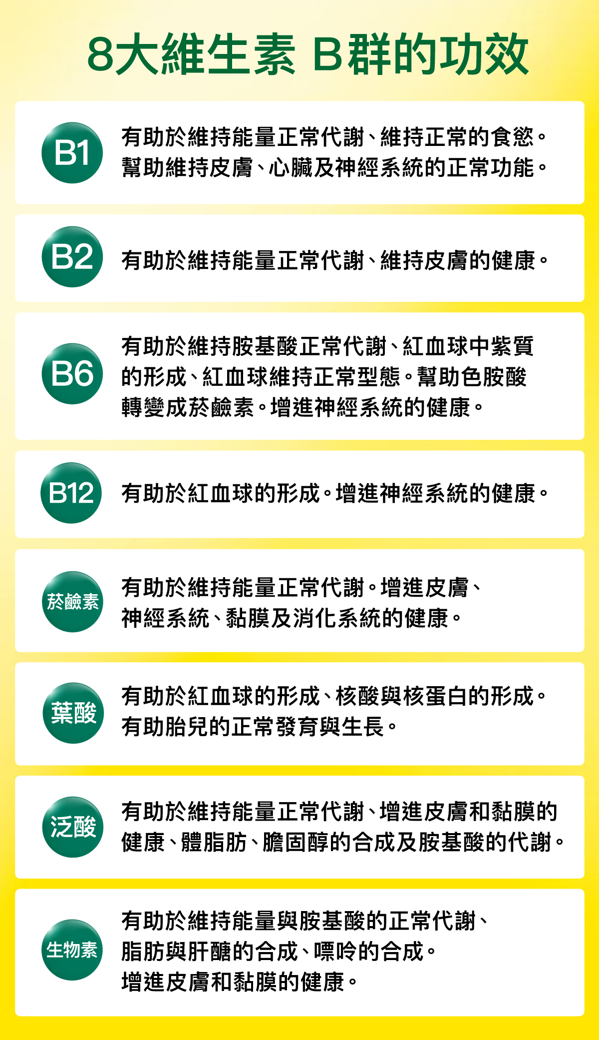 B群,顧名思義為一群維生素B組成,共有8個分別為:維生素B1、B2、B6、B12、菸鹼素、葉酸、泛酸與生物素。各自扮演重要的角色,所以如果您有在補充B群,請看看產品內是否含有以上8個維生素B,才能達到更全面增強體力、提振精神效能。
