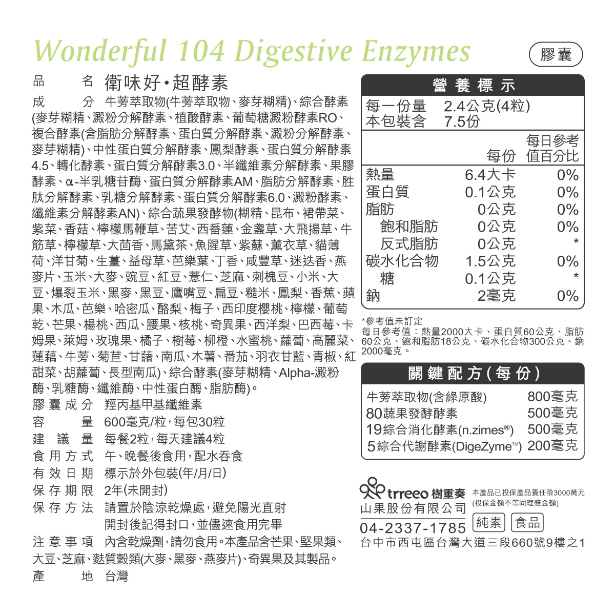• 美國n.zimes®19消化酵素500mg • 美國DigeZyme®5代謝酵素200mg • 日本BraziZyme®80久司酵素500mg • 台灣專利萃取牛蒡精華 800mg